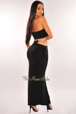 Deliver super chic vibes in this baby blue gold ring skirt two piece set. Made with a strapless neckline and wrap around matching skirt with slit to complete the look.