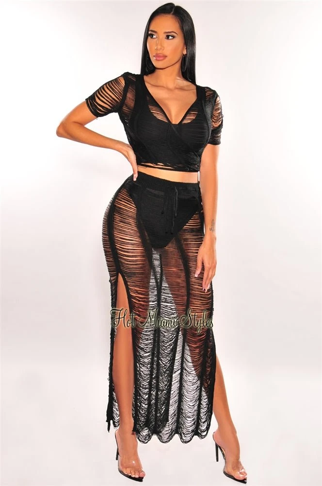 Black Crochet Knit Sheer Skirt Two Piece Set Cover Up