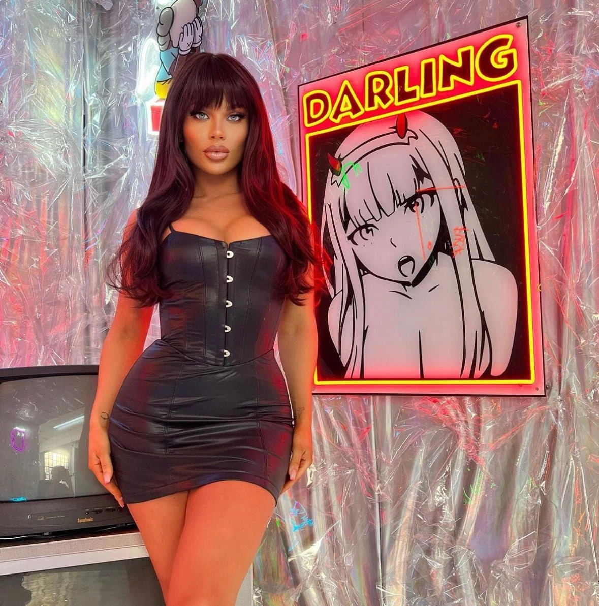 Show off an edgy and sexy look in this black faux leather dress. Designed on a mini silhouette with adjustable spaghetti straps and corset bodice.