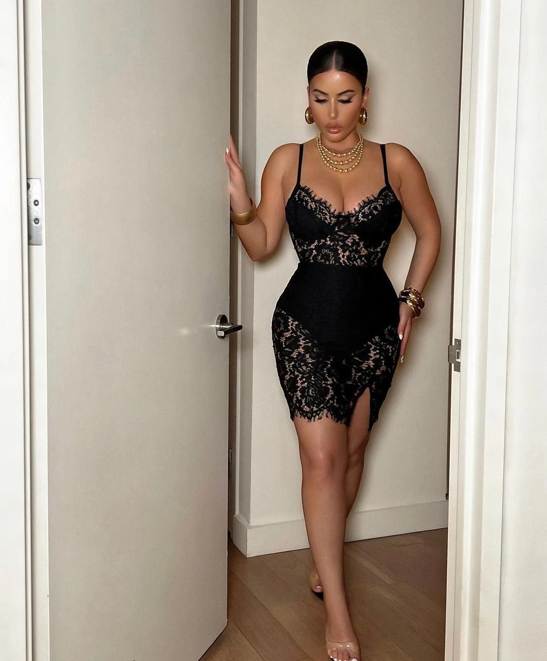 This super sexy little black dress will make them beg for more! Features a sheer floral lace bodice on a spaghetti straps design, on the perfect mini dress length with a slit to complete the look.