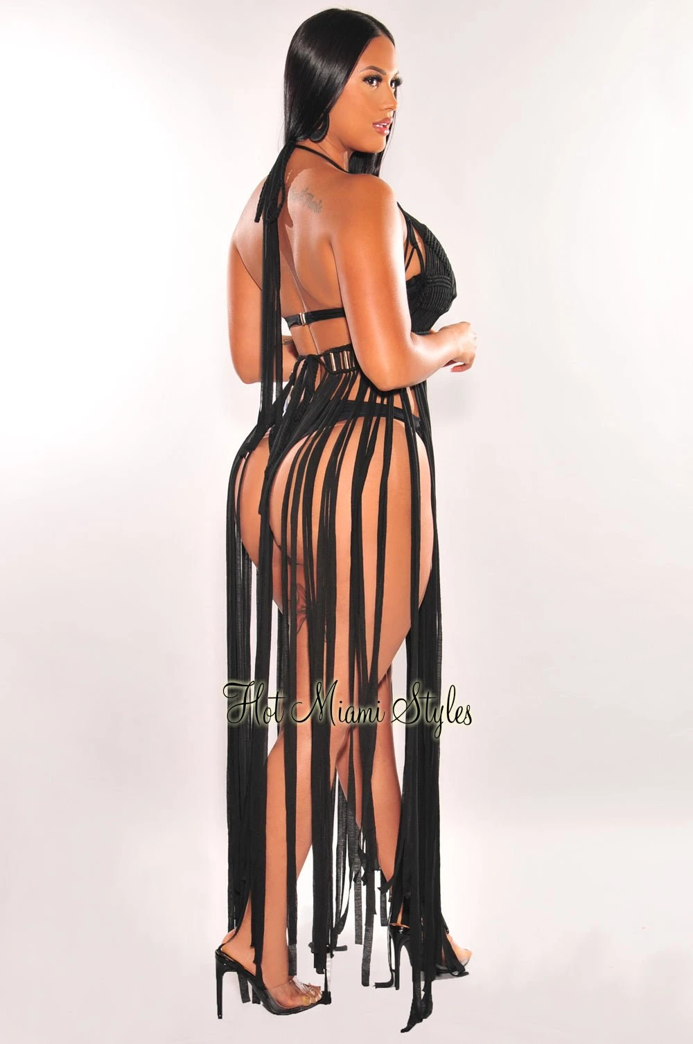 Black Halter Crochet Knit Fringe Open Back Tie Up Cover Up