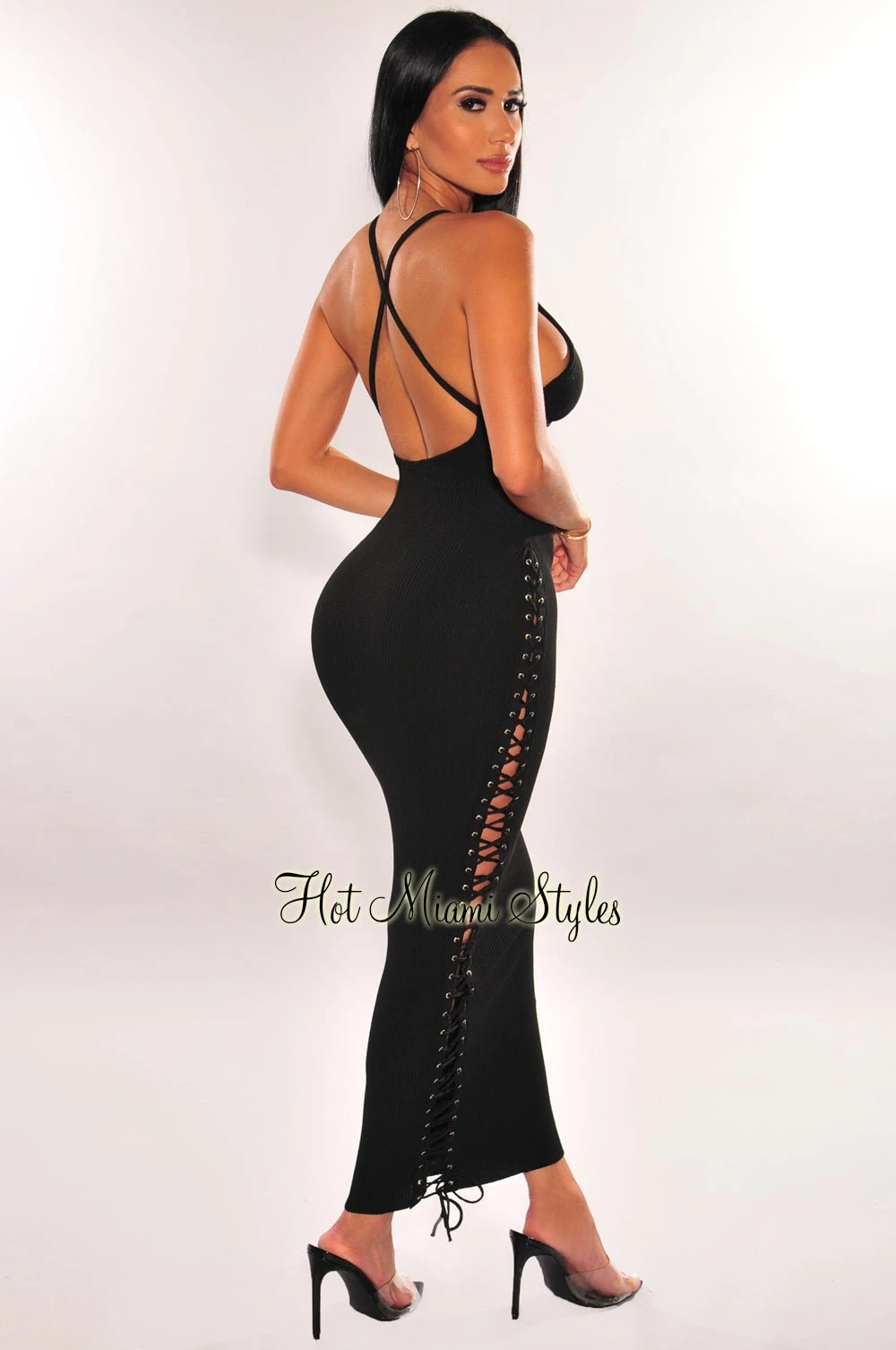 Slay in this contouring black lace up side dress. Featuring a body hugging ribbed knit fabric on a maxi silhouette.