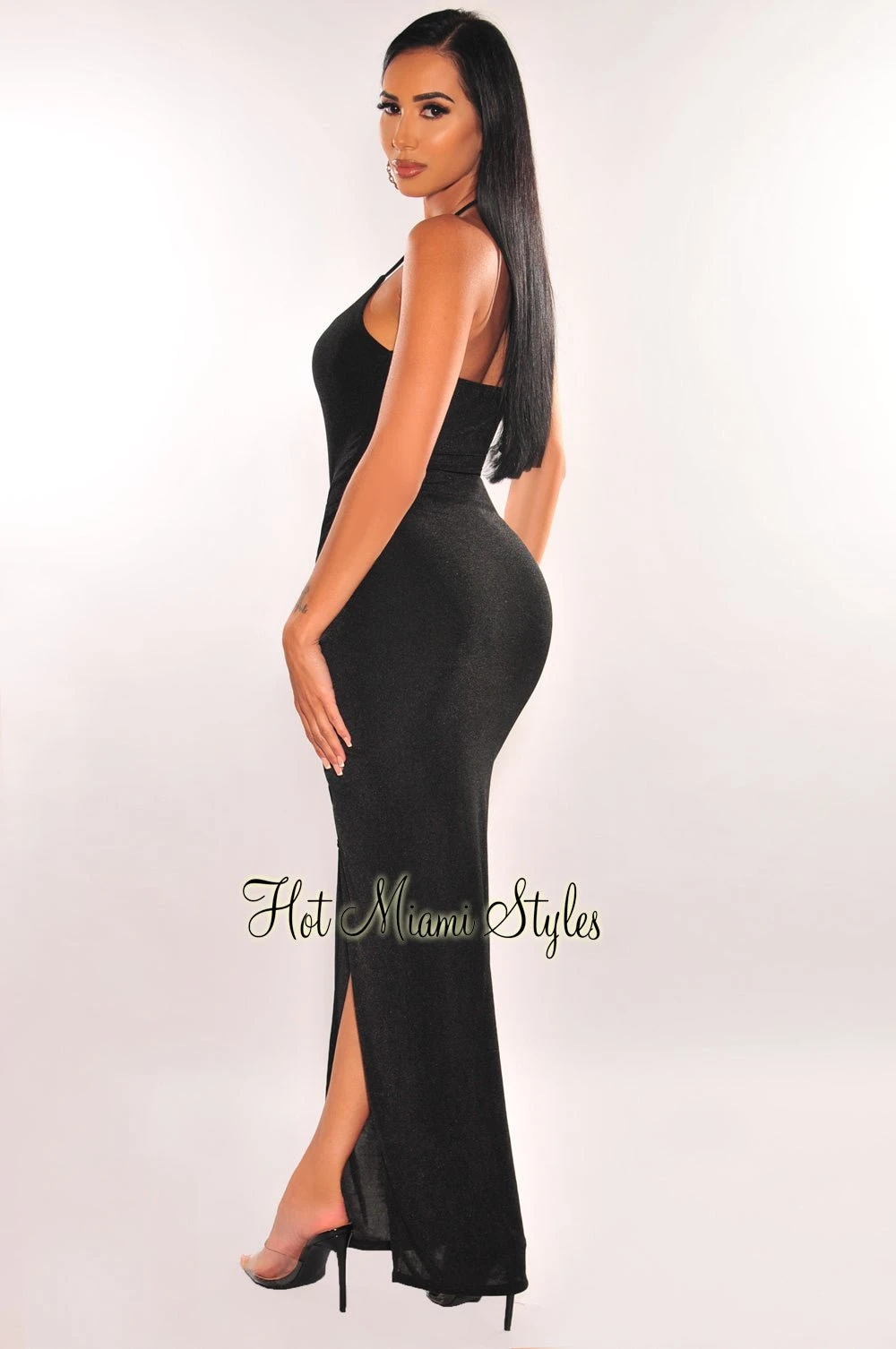 #Obsessed over this black shimmery maxi dress! Featuring a halter neckline, stretchy ribbed fabric, drawstring detail on a sultry maxi length.