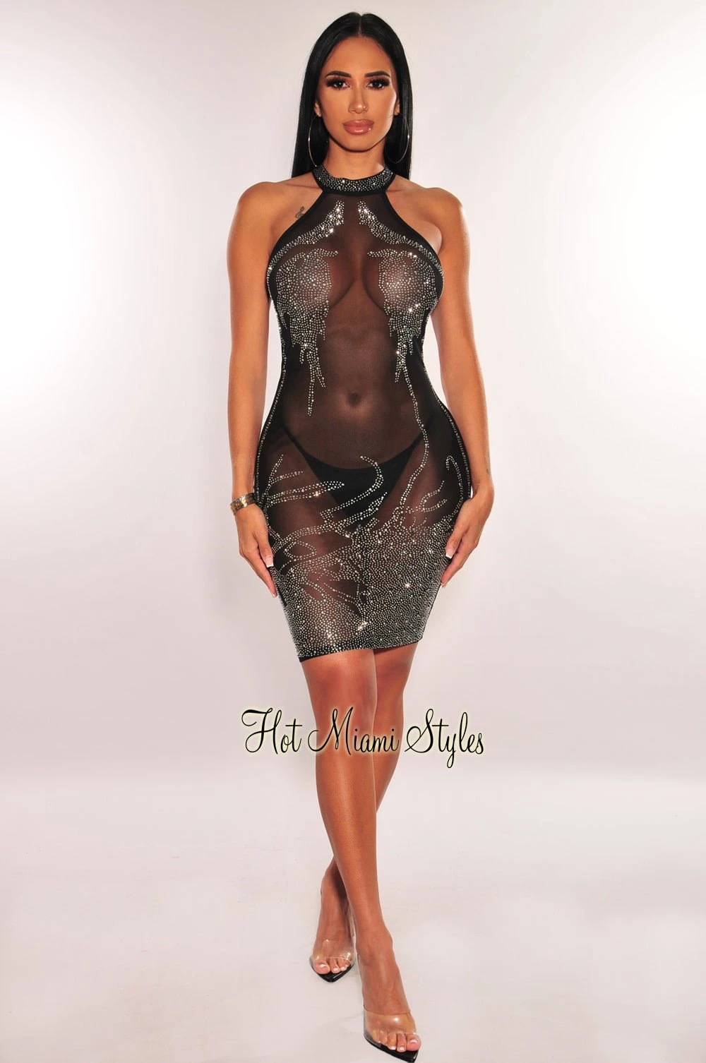 Make an unforgettable entrance in this gorgeous curve-hugging rhinestone sheer mesh dress. Features a halter neckline on a mini silhouette.