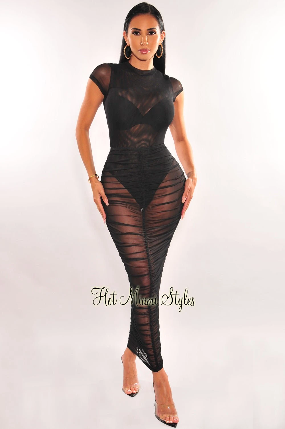 Get the whole look with this sultry two piece set! This black set comes with a black double lined bodysuit and matching sheer mesh ruched skirt.