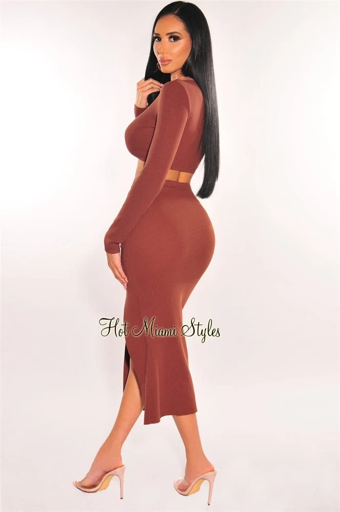 Deliver super cute chic vibes in this two piece set. Featuring a faux button up long sleeve crop top made out of the perfect ribbed knit fabric and a matching ruched slit skirt to complete the look.