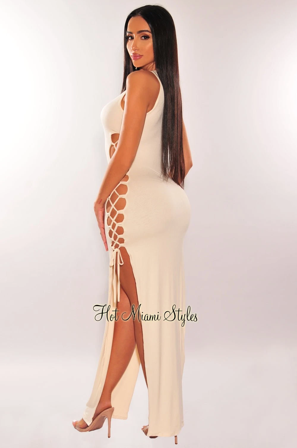 Make a statement in this effortlessly chic maxi dress. Featuring sultry lace up sides and slit.
