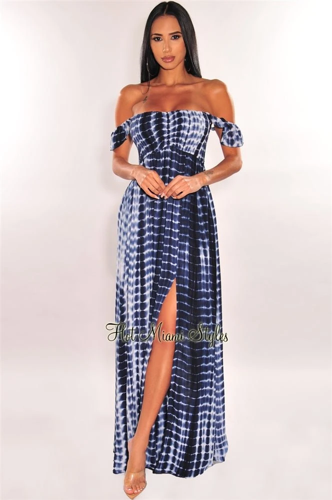 Deliver flirty chic vibes in our tie dye print maxi dress. Featuring fun ruffle straps may be worn off shoulder and a smocked bust design on a flowy slit maxi silhouette.