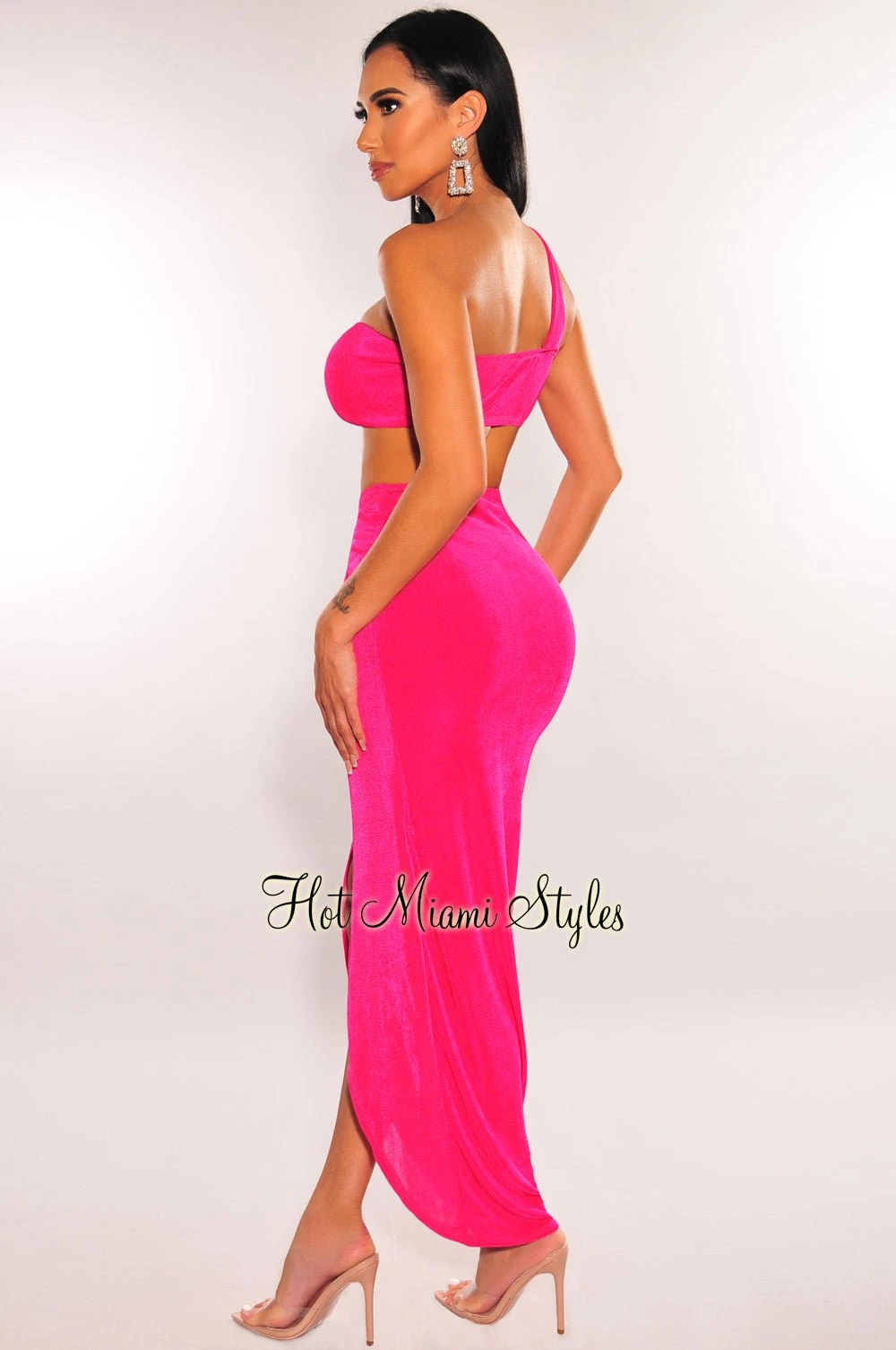 Amp your two piece collection with this perfect set. Featuring an ultra stretchy ribbed body hugging fabric with a one shoulder crop top paired with a matching knotted skirt.