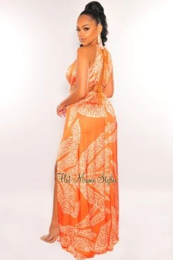 Feel like a total paradise in this fabulous maxi dress. Features a sexy adjustable halter neckline with a wooden O-Ring belt detail on a sultry cutout slit design.