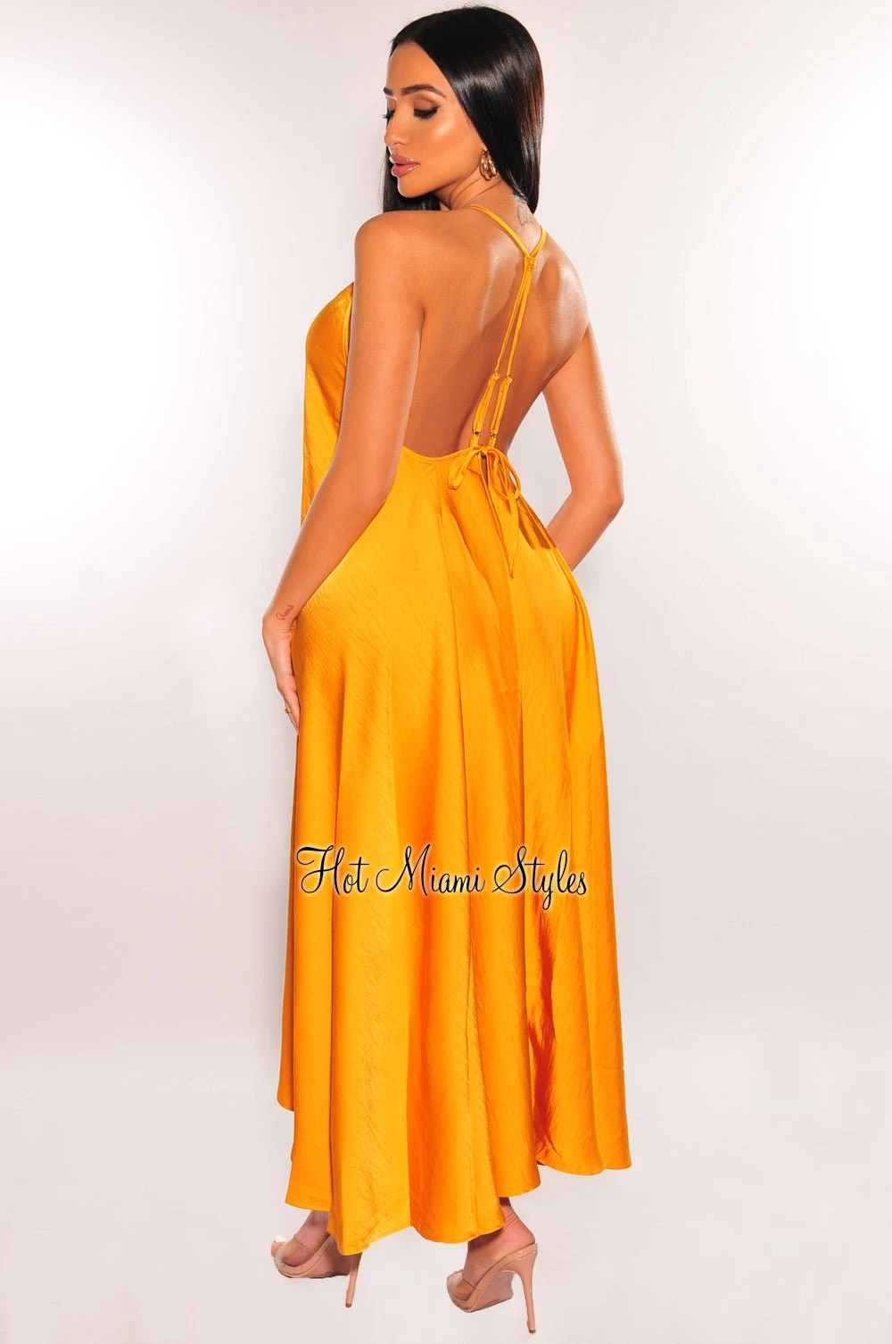 This golden silky dress is everything you need in your wardrobe! Featuring a sultry v neck design and an appealing back design on a perfect maxi silhouette.