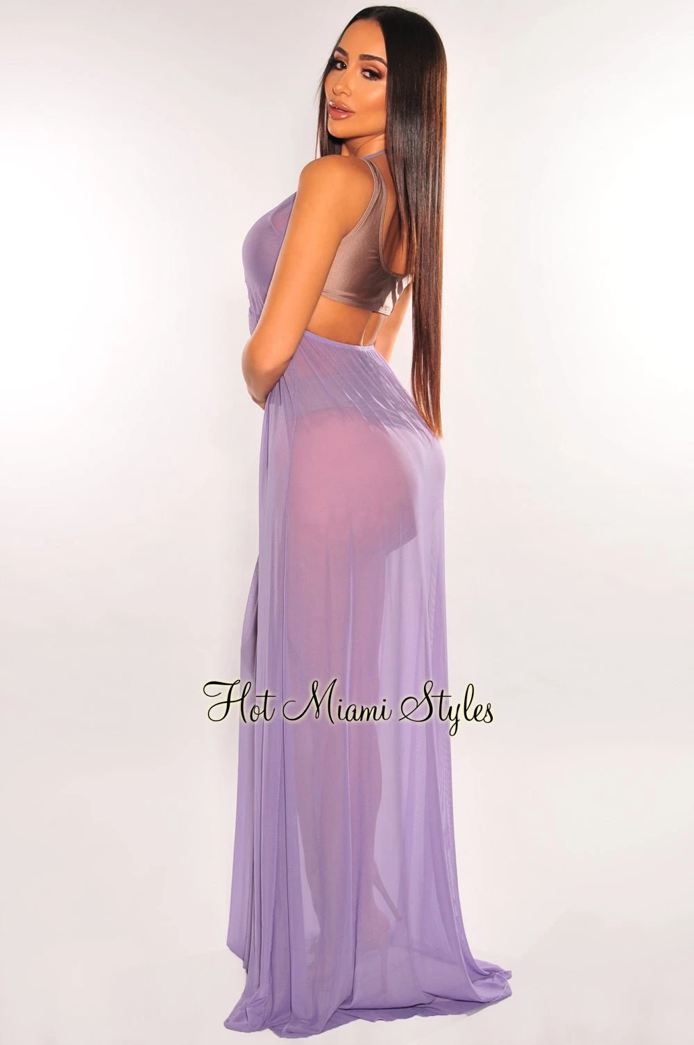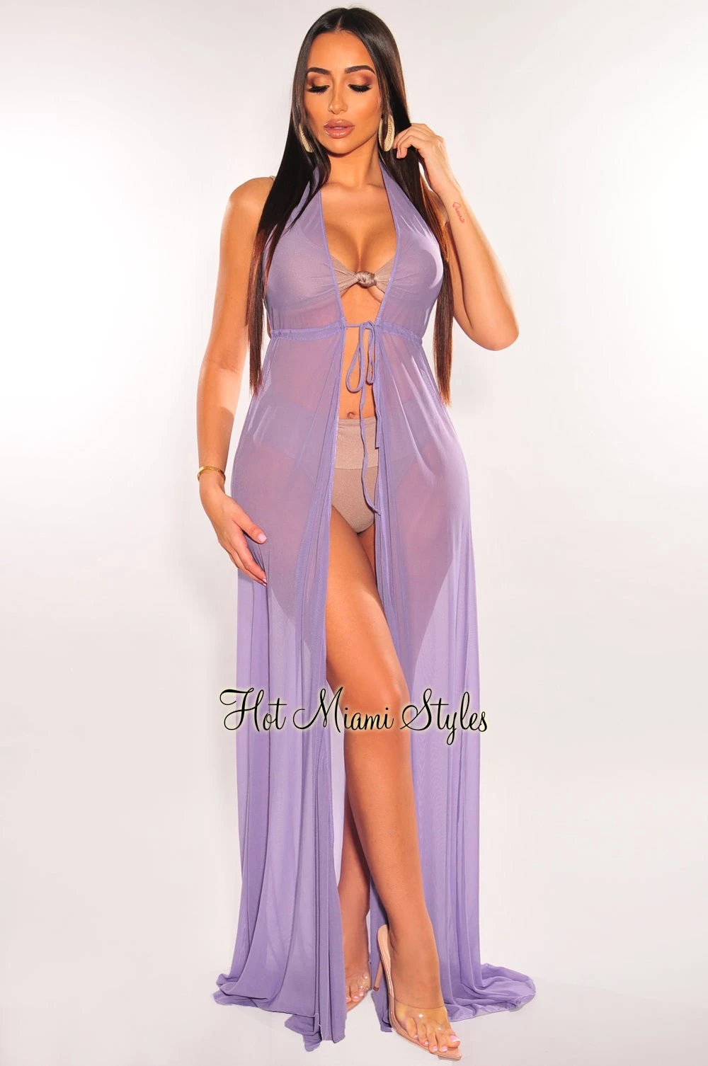 This mesh maxi cover up is everything we are currently loving. Designed with a halter neckline and an open back with drawstring detail. Pair with your favorite HMS swimwear.