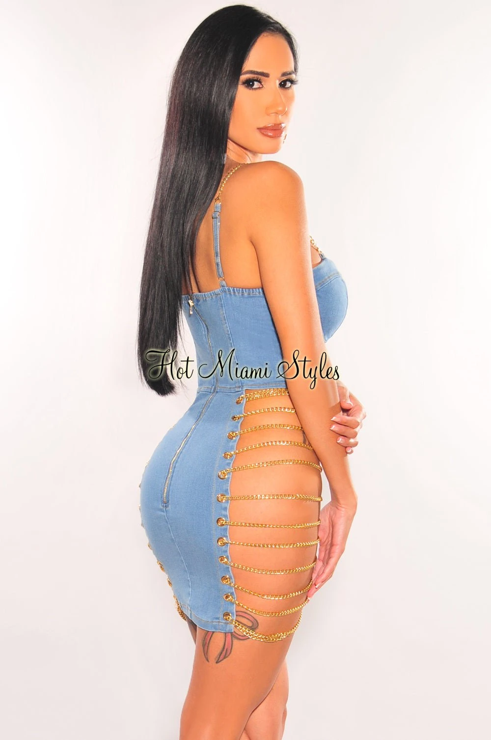 Statement dressing done right. Designed with a stretchy light denim fabric, gold chain lace up sides and a bust keyhole detail on a mini silhouette.
