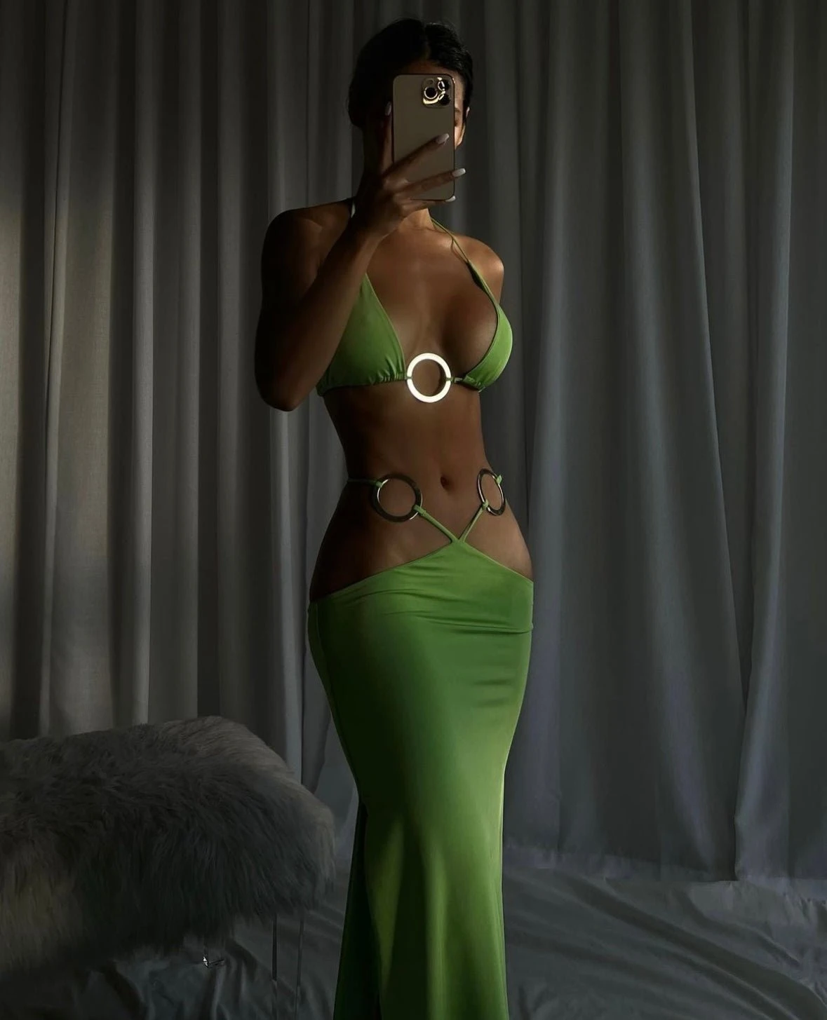 Stand out from the crowd in this bold strappy two piece set. Featuring silver O-ring details and matching sexy double slit maxi skirt for a weekend-worthy fit.