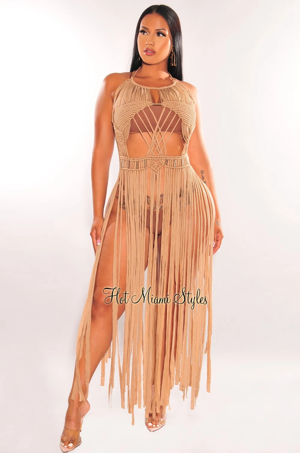 This crochet fringe cover up is everything we are currently loving with a gorgeous open back and tie up detail. Pair with your favorite HMS swimwear.