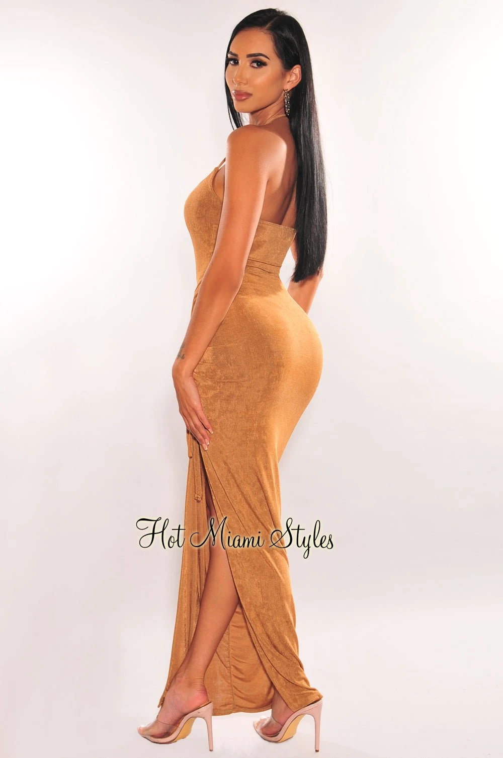 #Obsessed over this mocha shimmery maxi dress! Featuring a halter neckline, stretchy ribbed fabric, drawstring detail on a sultry maxi length.