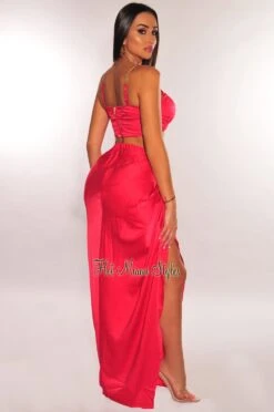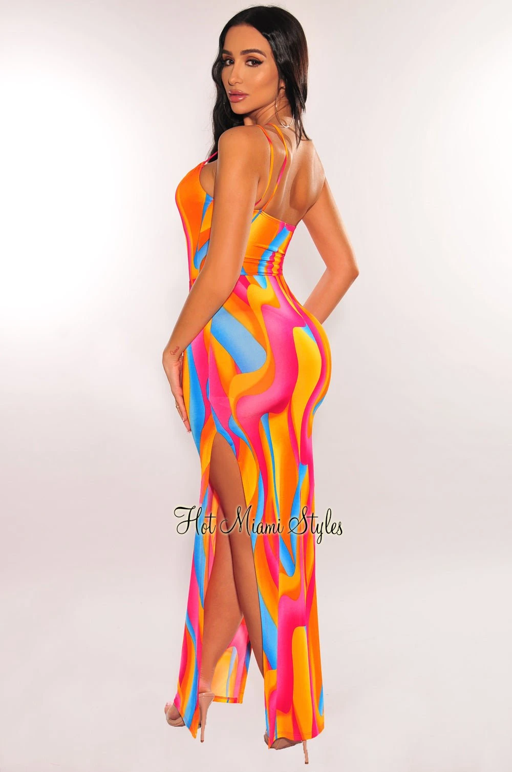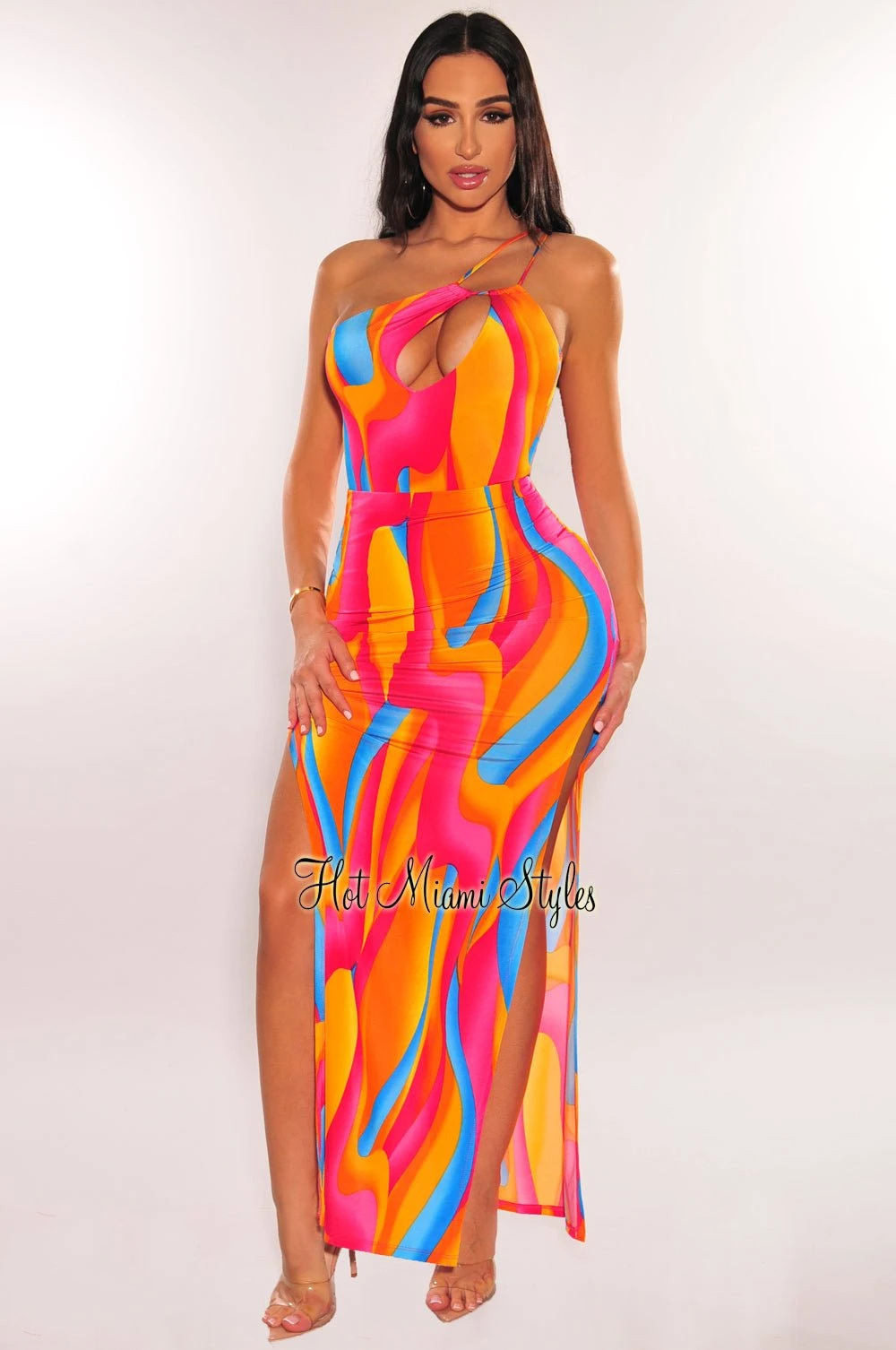 Get the whole look for your next event with this multi color swirl print two piece set! Designed with a one shoulder bodysuit paired with a drawstring double slit skirt.