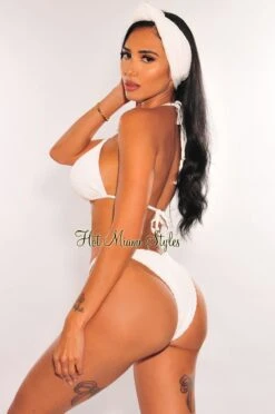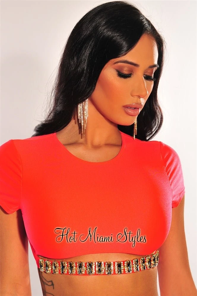 Treat your bikini collection to this glamorous style with our neon coral crop bikini. Features a stretchy and soft fabric, a crop top design featuring a diamond jeweled strap cut out and figure flattering bottoms.