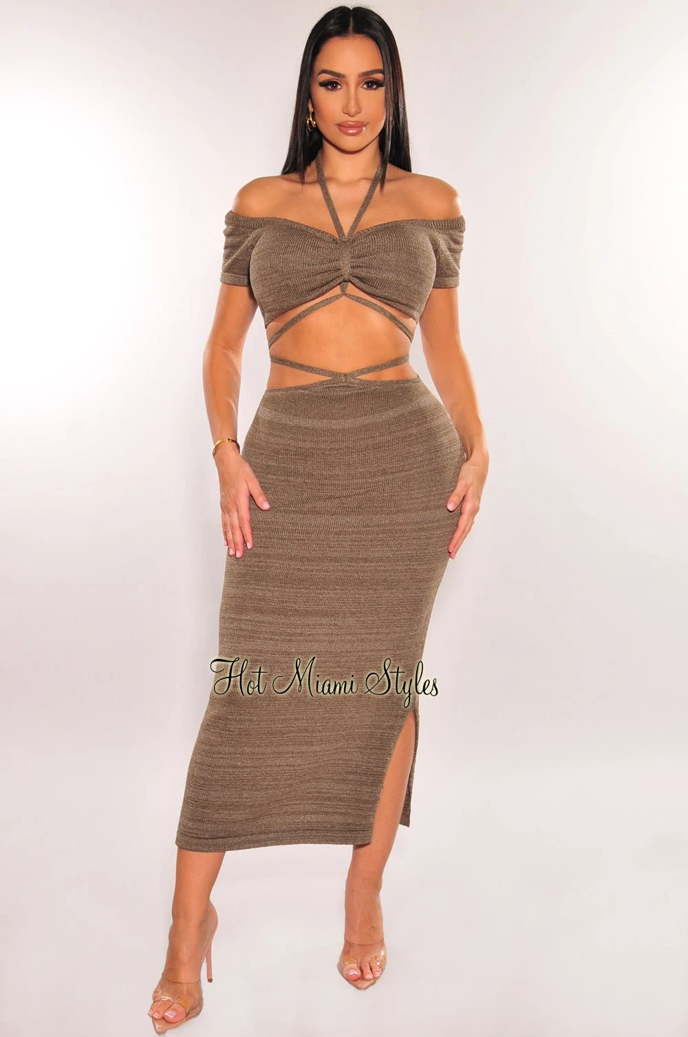Make a statement in this two piece olive green beauty. Featuring a halter off shoulder top with wrap around design, super stretchy ribbed knit fabric and gorgeous slit skirt.