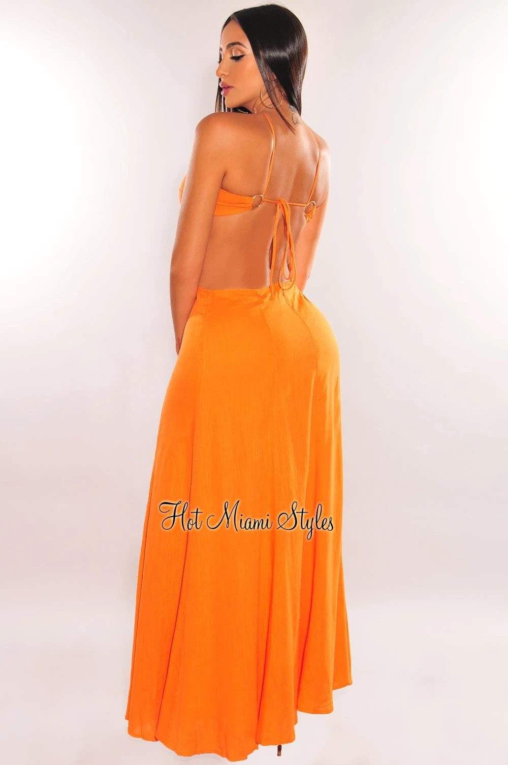 This orange linen maxi dress takes you from daytime shopping to dinner with ease. Featuring a halter neckline, O-ring details and cut out design. Perfect for any occasion.