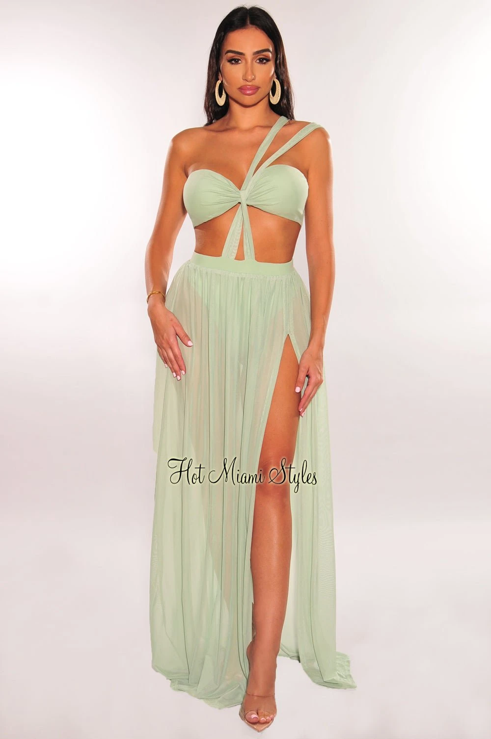Designed with the thought of you, this sage dress is sure to make a statement. Features a one shoulder neckline, a cut out side design on a maxi silhouette.