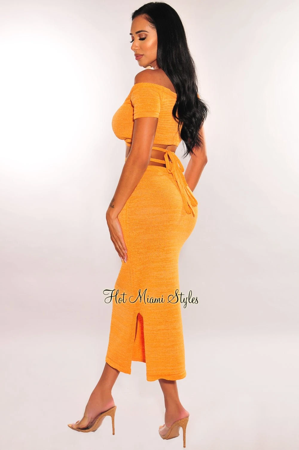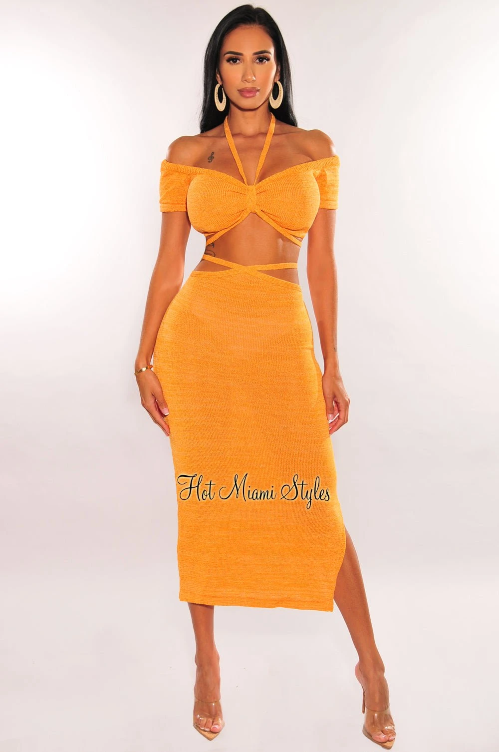 Make a statement in this two piece tangerine beauty. Featuring a halter off shoulder top with wrap around design, super stretchy ribbed knit fabric and gorgeous slit skirt.