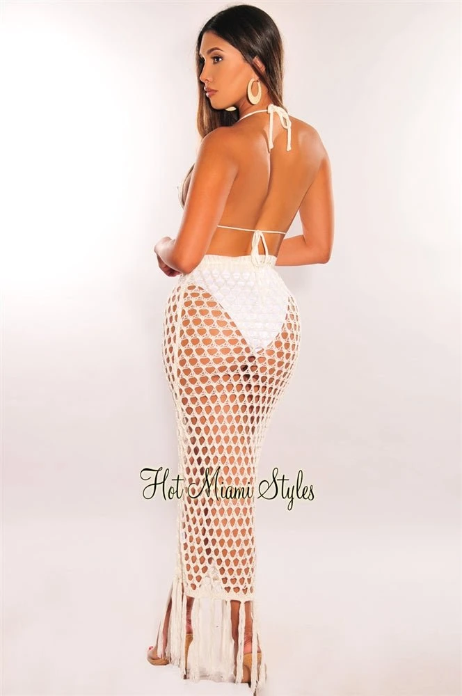 Your new favorite two piece set cover up is here! This look is one you can’t pass up, made with a beautiful crochet bodice featuring fringe details on a halter top and matching maxi skirt.