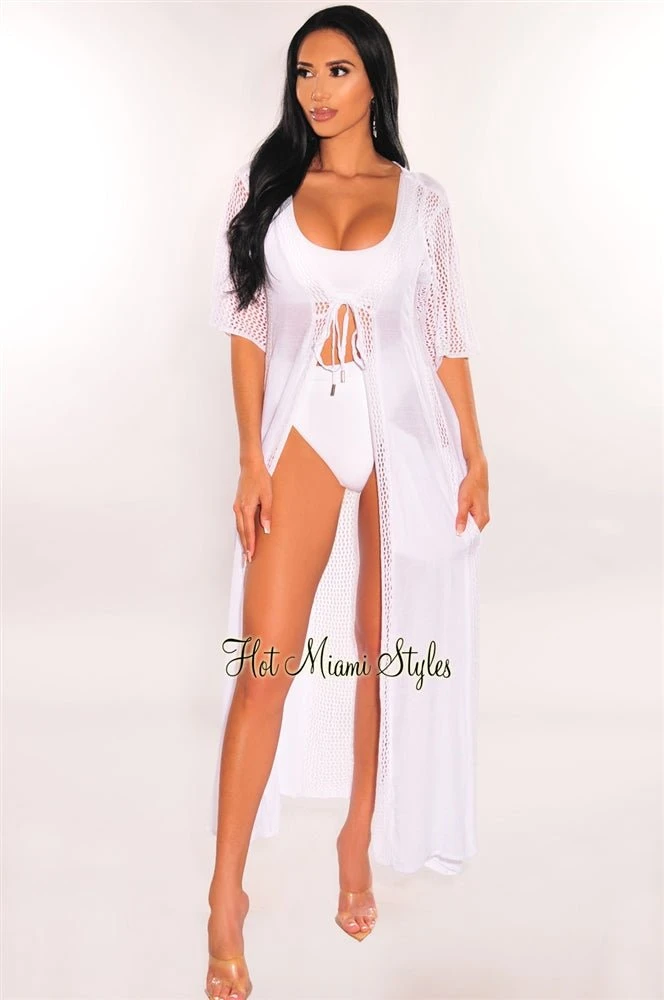 The perfect layering piece for all the swimwear looks, this tie up cover up is everything we are currently loving with a maxi length and a beautiful crochet detailed design.