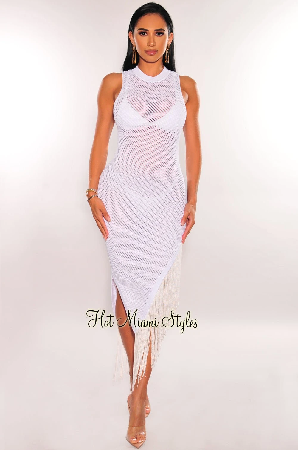 Cover up in crochet for the most luxurious look. FeaturingĀ a sheer bodiceĀ and an eye-catching fringe hem that moves beautifully as you walk.
