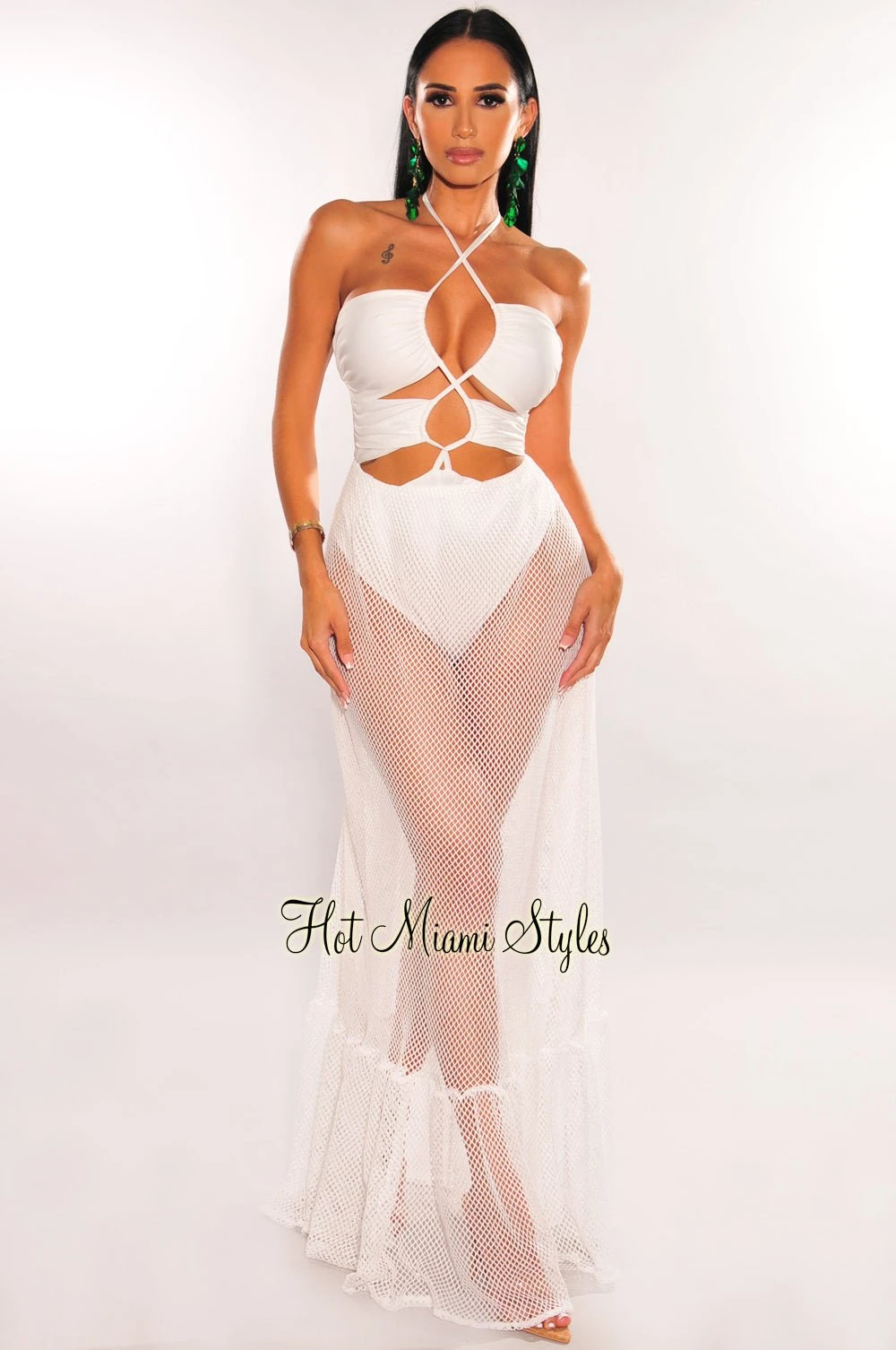 Make an entrance in this lace up maxi dress. Designed with a halter neckline, fishnet detail and sultry cut out design.