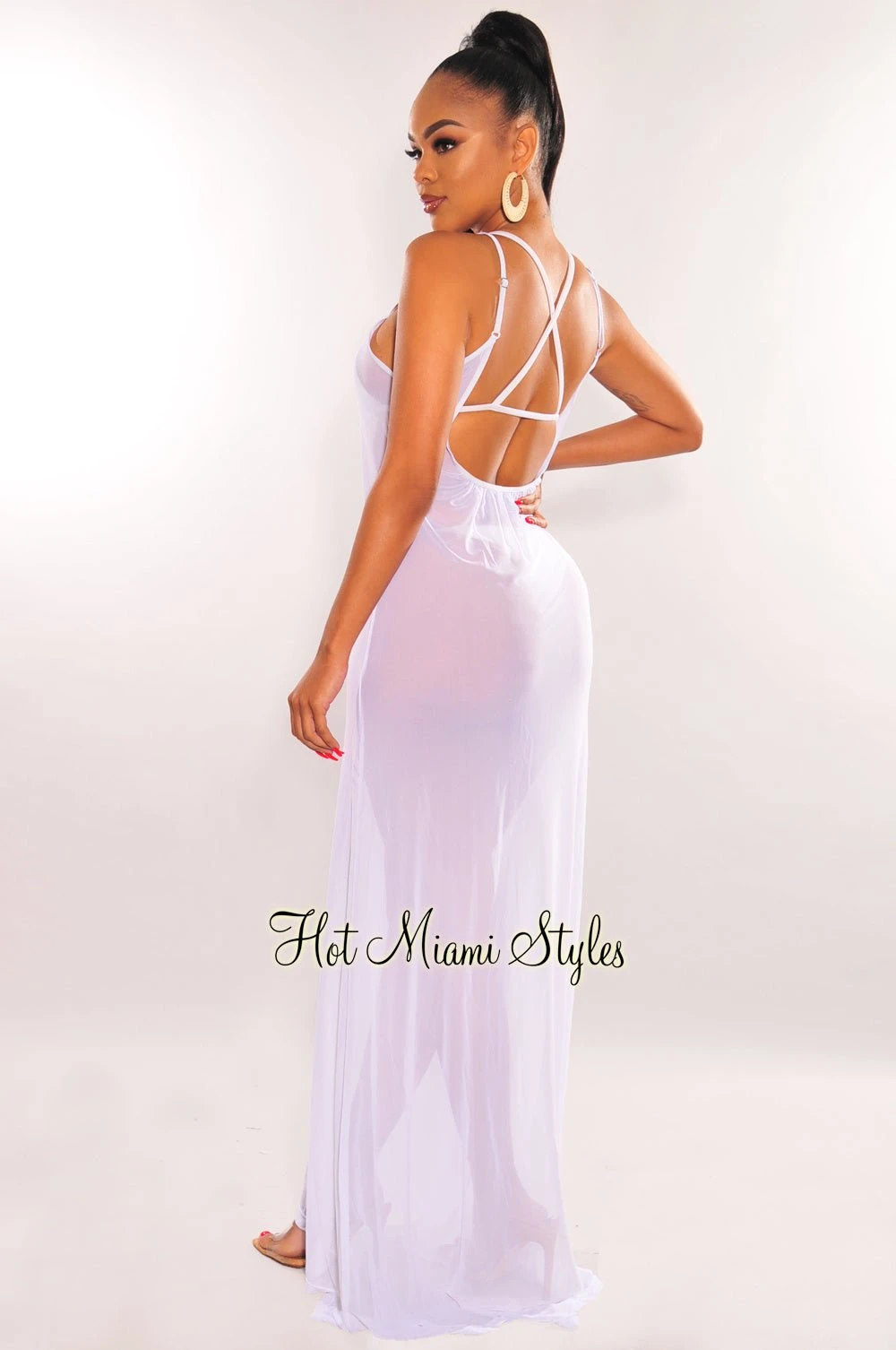 Steal the show with this sexy yet classy cover up dress. Featuring a sheer mesh fabric to show off your favorite HMS swim on the perfect maxi length dress.