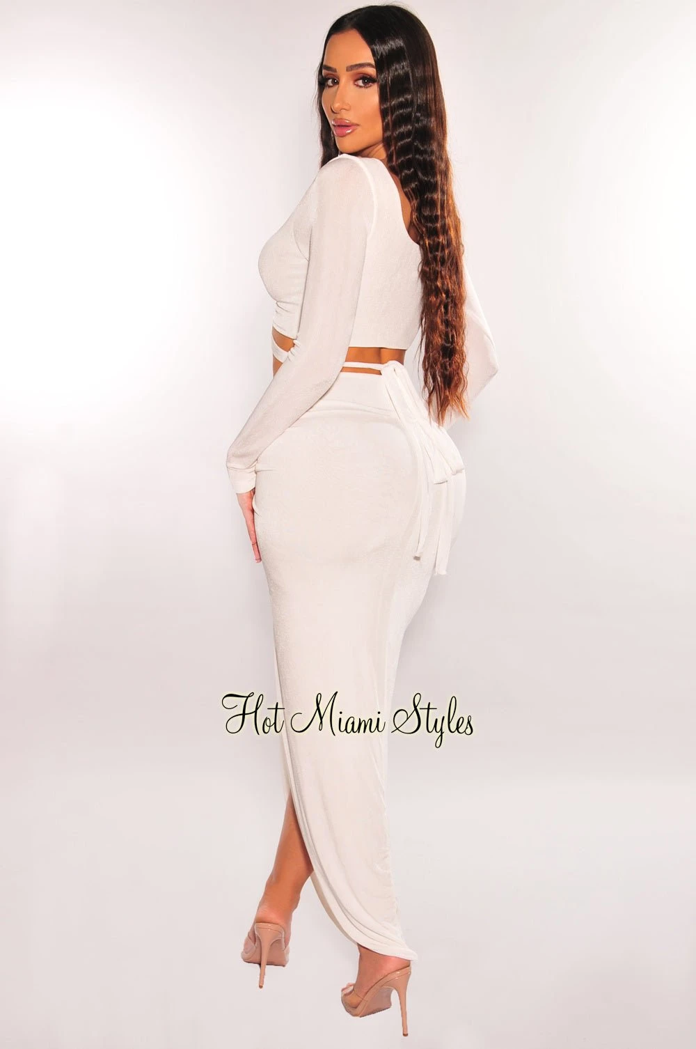 Take your look to a whole new level in this two piece set. Made on a V neckline with long sleeves and matching skirt with shimmery bodice and knotted slit. The two piece set will hug your curves just right.Â