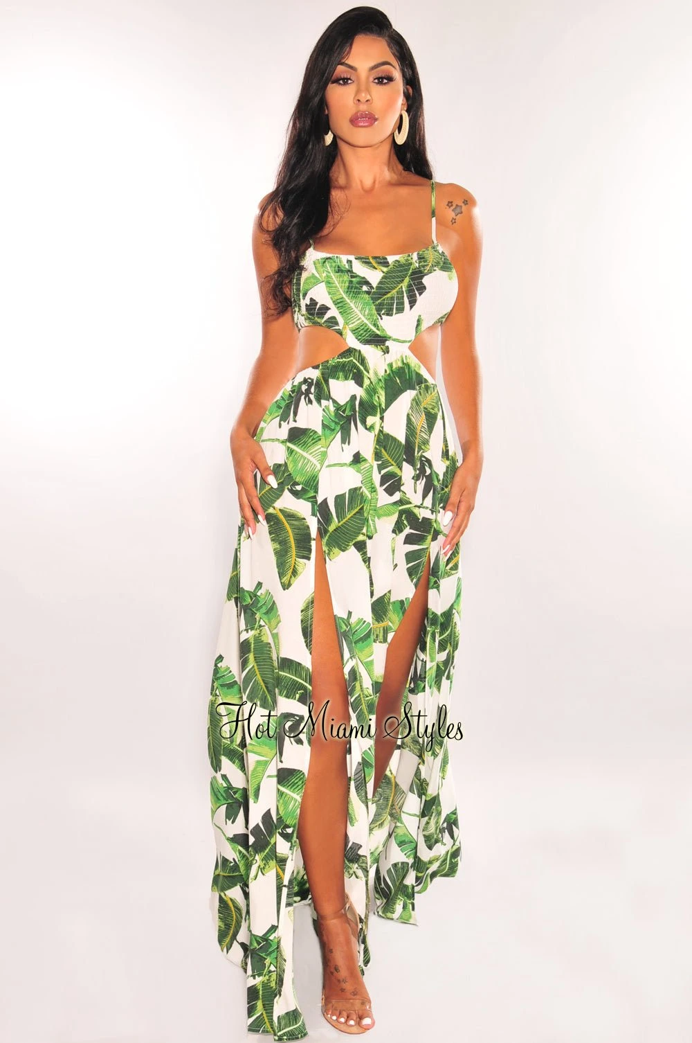 Feel like a goddess every step you take in this white palm print cut out maxi dress. Designed with a smocked bust and sexy double thigh high slits. Perfect for your getaway.ย